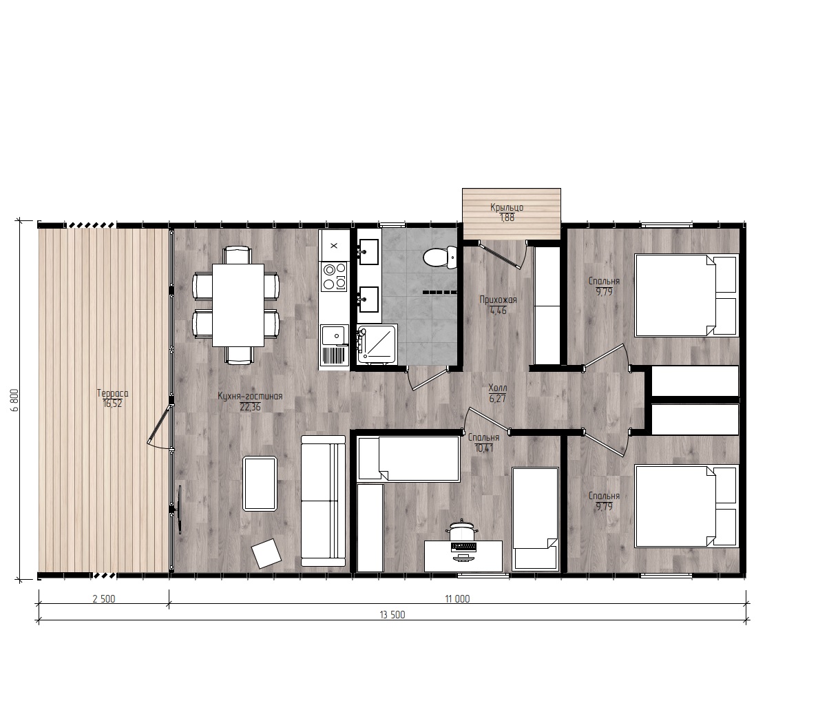Тип крыши: Двускатная, 15 градусов, без чердачного перекрытия