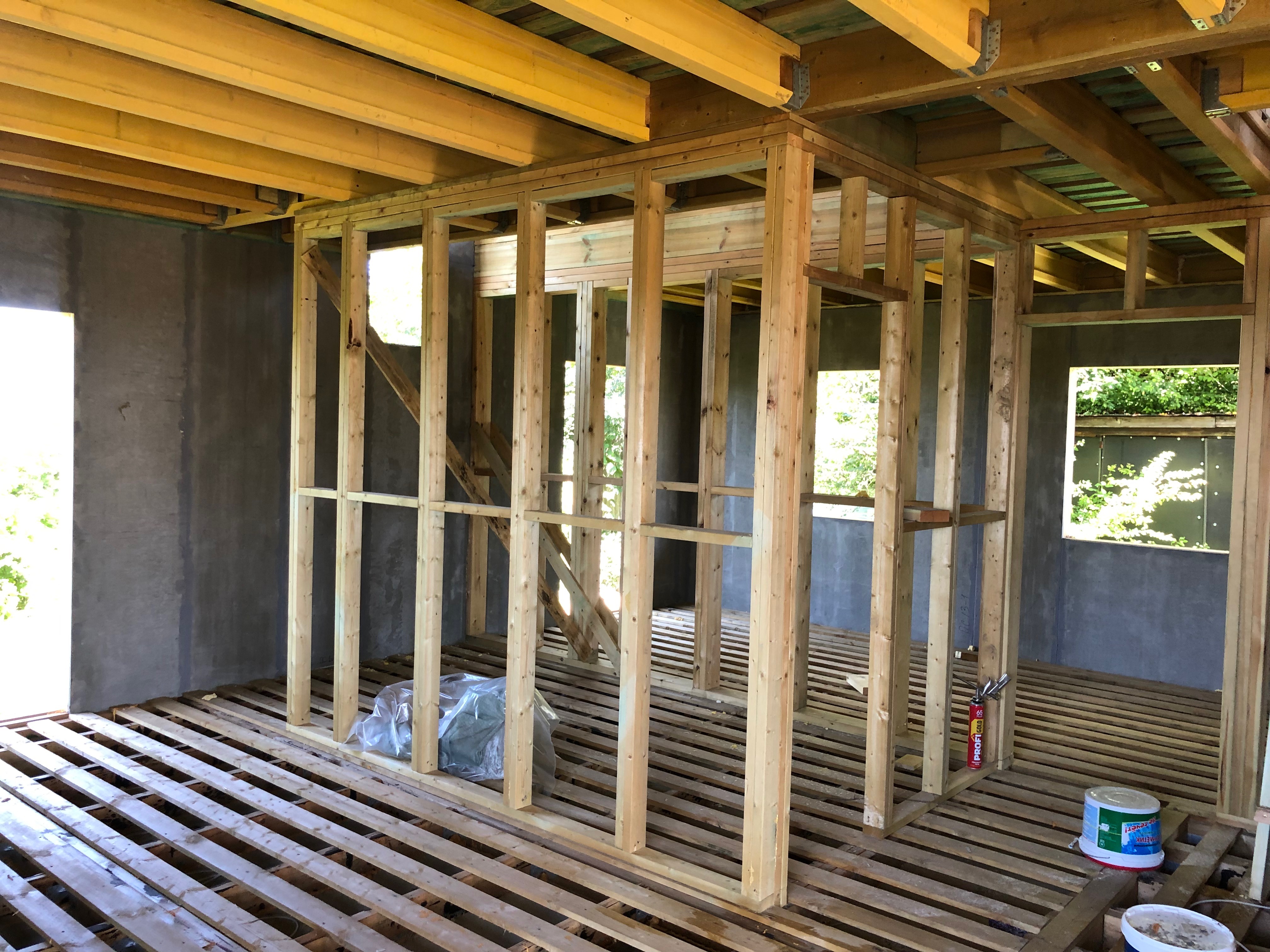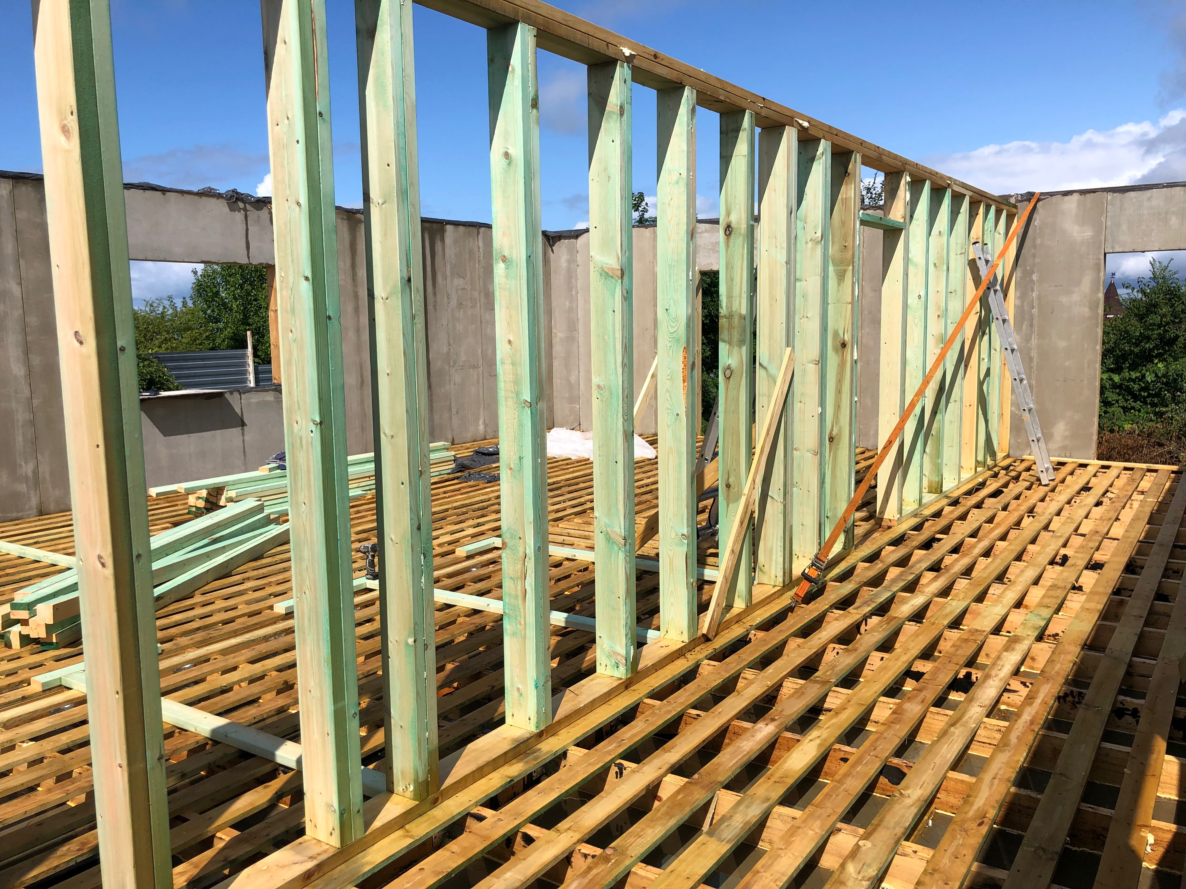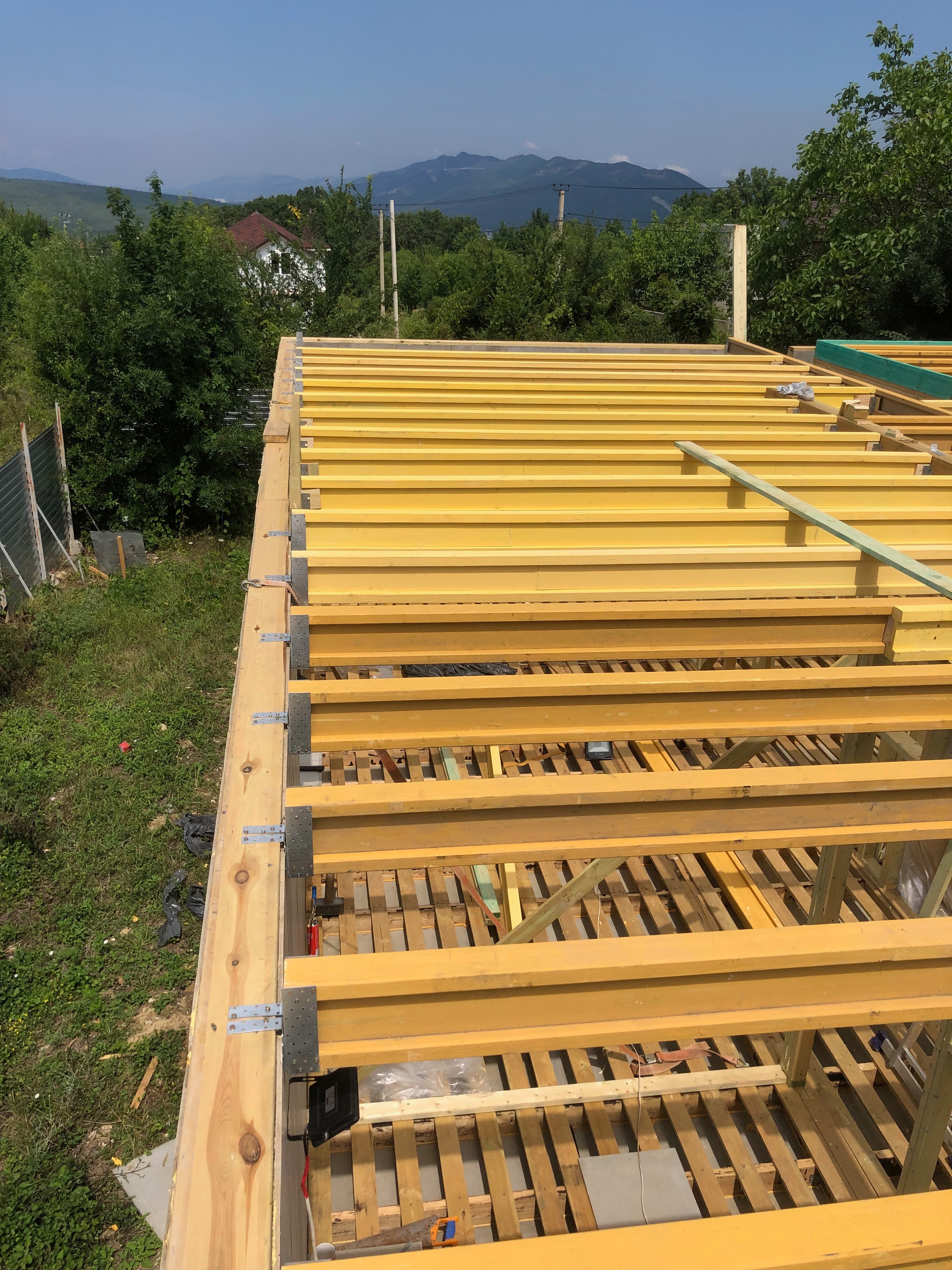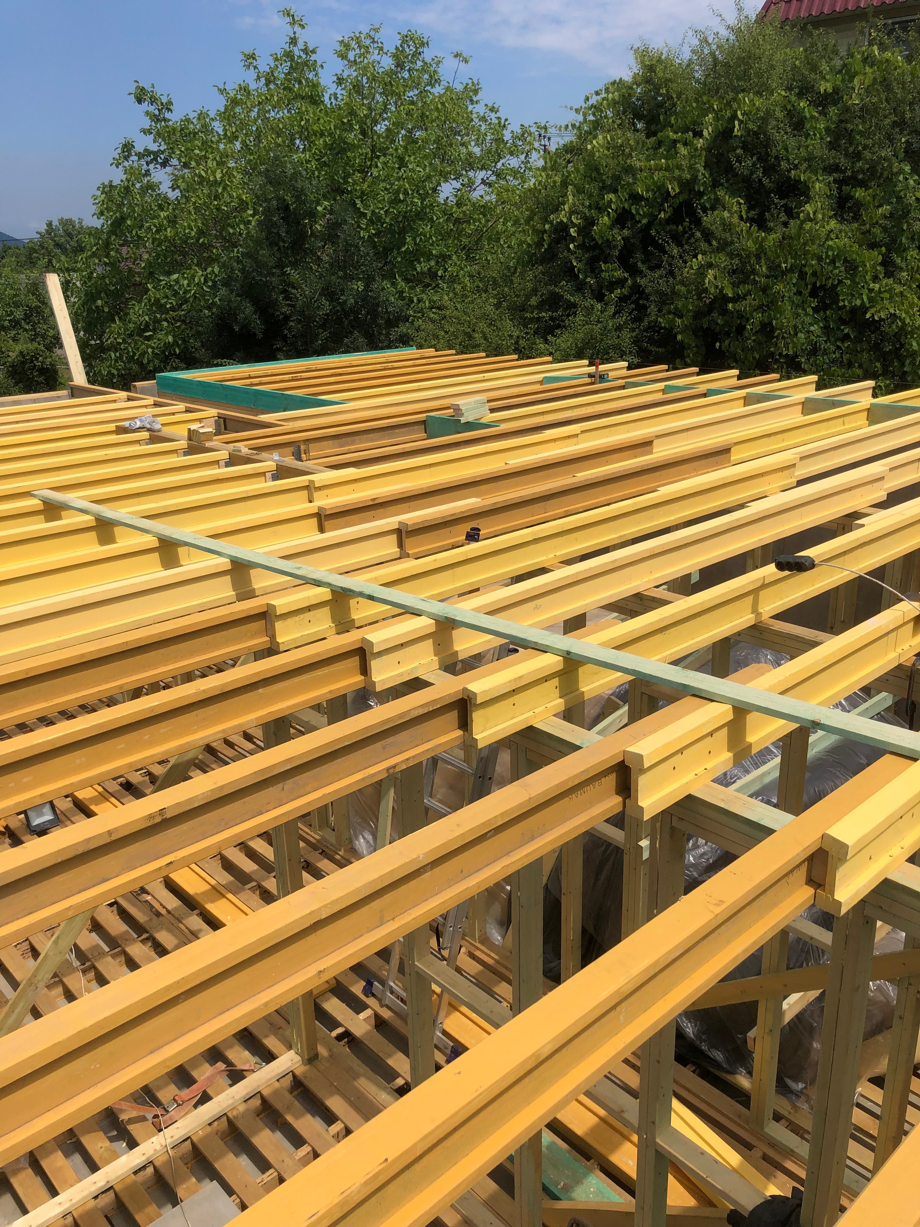 В межэтажных перекрытиях в качестве несущих лаг мы применяем двутавровые балки собственного производства с влагостойкой 24 мм. фанерой в сердечнике.