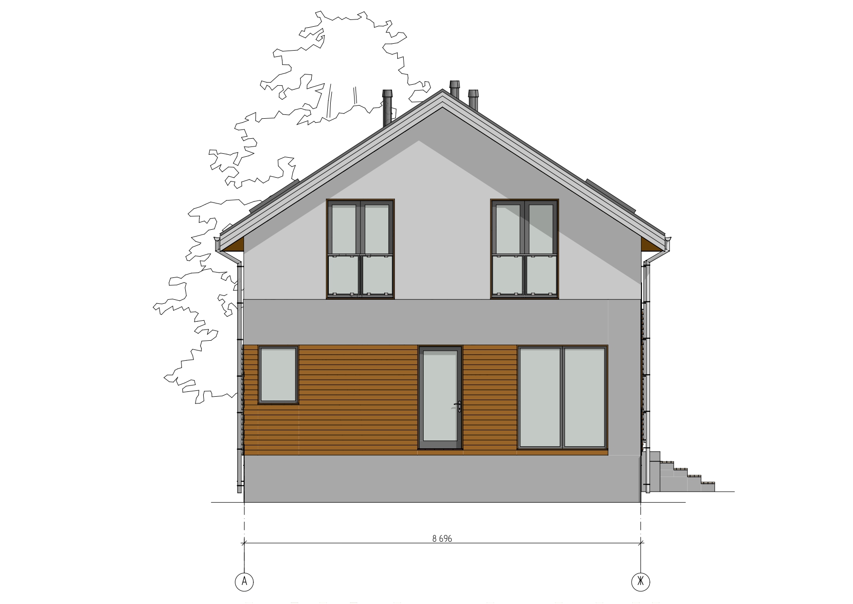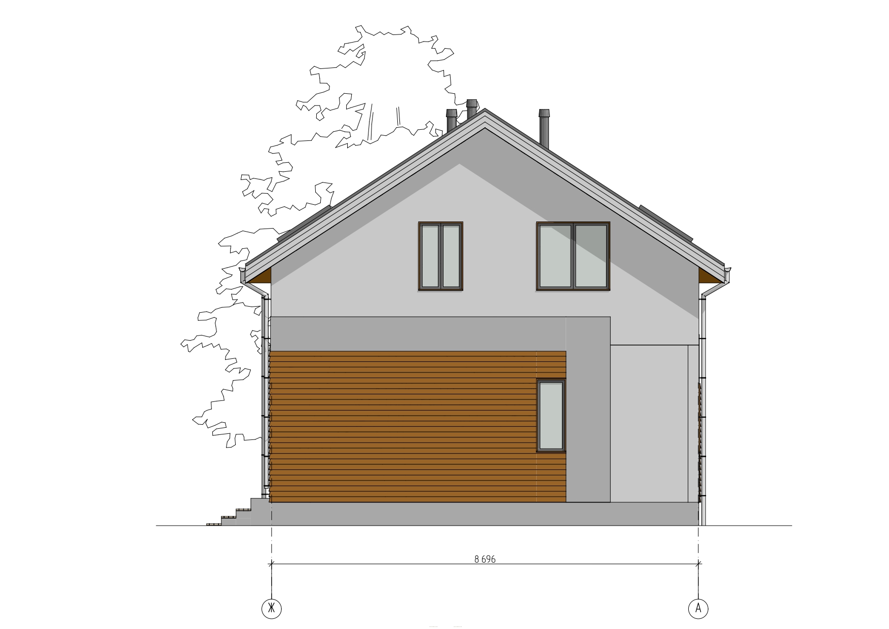 пиломатериал 1-го сорта естественной влажности, антисептированный (стропила 50*150 мм, обрешетка, поперечная обрешетка), пароизоляция А, D, утеплитель 150 мм, софиты (С-8 профиль), кровля - металлопрофиль (металлочерепица).