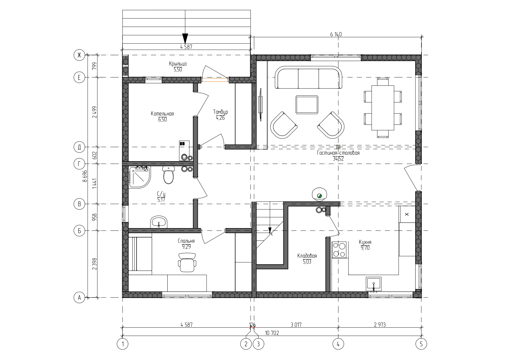 • Внутренние перегородки-каркас из сухой строганной доски: несущие 46х145 мм.. Стены готовы для обшивки листовыми материалами или декоративной доской.