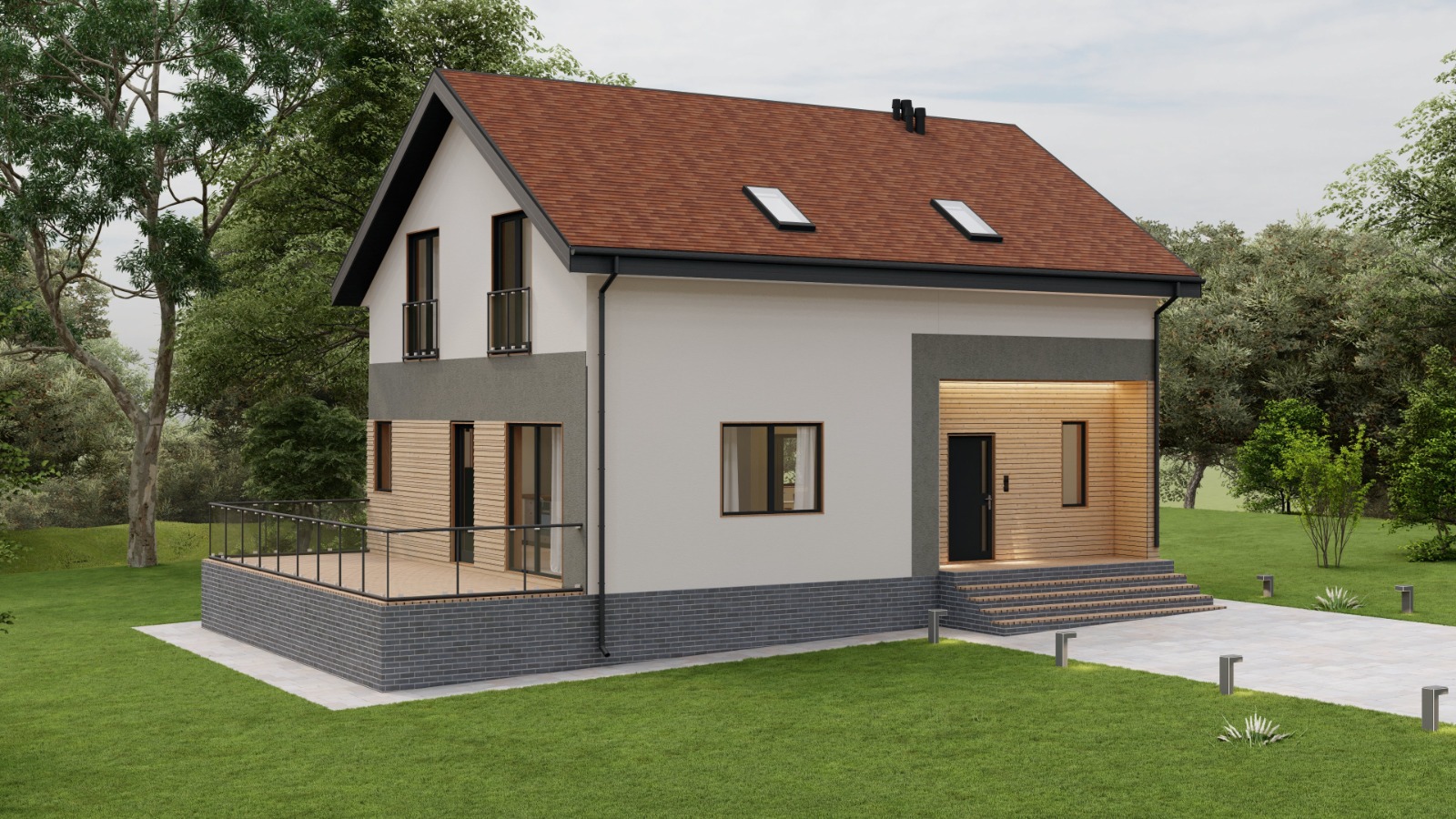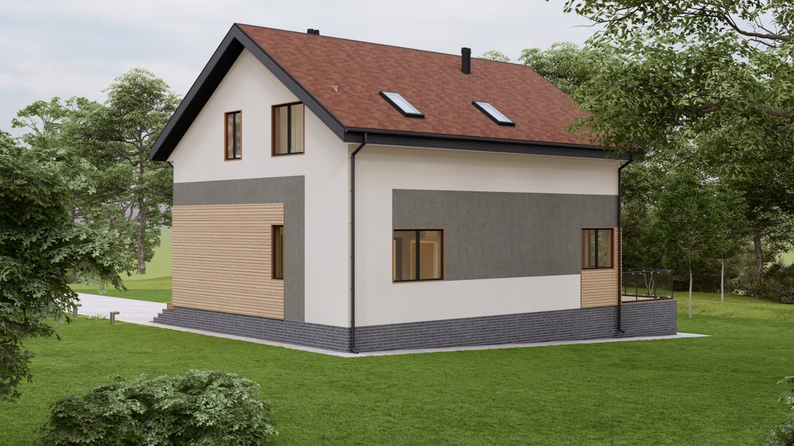 • Плоская или скатная утепленная кровля (пароизоляционная пленка, утеплитель вата на основе стекловолокна или базальта, гидро-ветрозащитная мембрана) с покрытием из металлочерепицы, полимерной мембраны или гибкой черепицы. (цена отличается от выбранного типа) (Ширина карнизного свеса от 30 см. Водосточная система в стоимость не входит