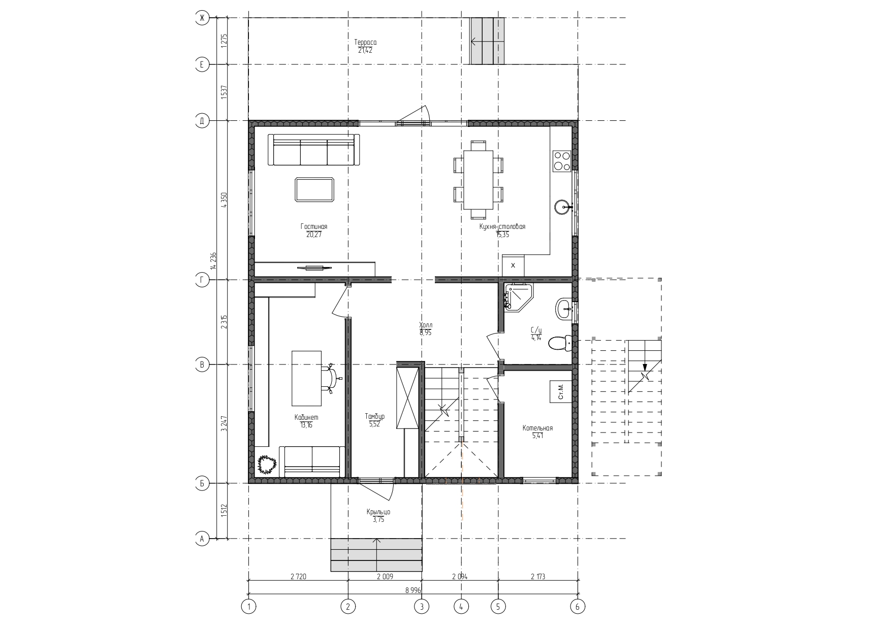 • Внутренние перегородки-каркас из сухой строганной доски: несущие 46х145 мм.. Стены готовы для обшивки листовыми материалами или декоративной доской.