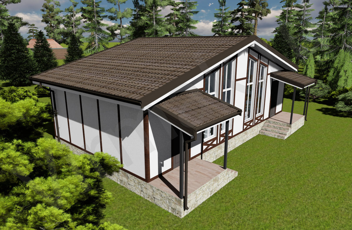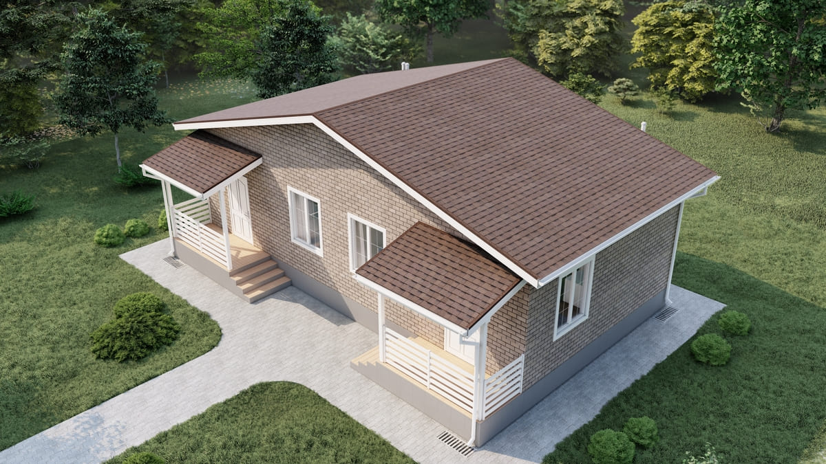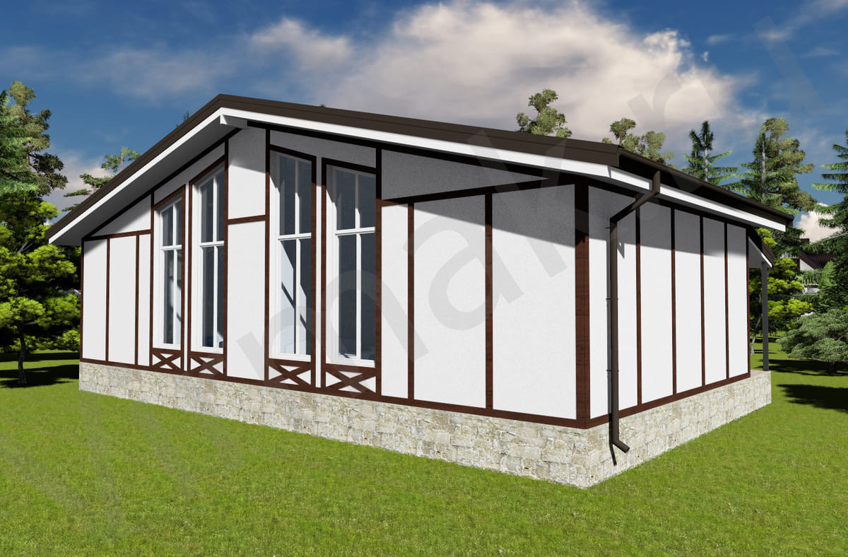 • Плоская или скатная утепленная кровля (пароизоляционная пленка, утеплитель вата на основе стекловолокна или базальта, гидро-ветрозащитная мембрана) с покрытием из металлочерепицы, полимерной мембраны или гибкой черепицы. (цена отличается от выбранного типа) (Ширина карнизного свеса от 30 см. Водосточная система в стоимость не входит