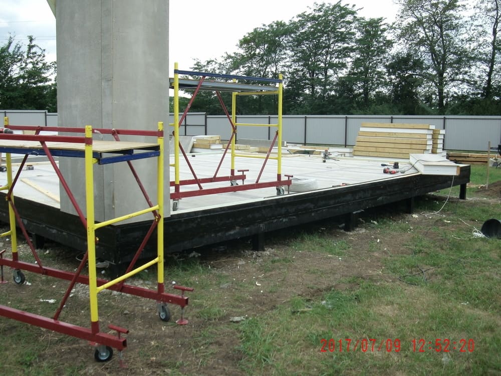 из СИП панелей из ЦСП размером 2700*1200*168 мм с антисептированным калиброванным пиломатериалом камерной сушки (46*140 мм). Монтаж каркасов несущих перегородок из пиломатериала 38*89 мм (76*89 мм).